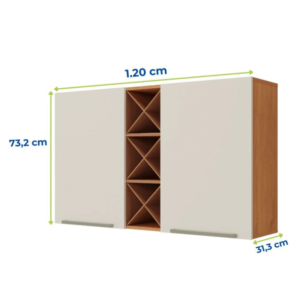Aereo 1,20 2 Puertas + Botellero Blanco/Cinamomo 9810200281 0000167-3800 Aereo Botellero – 1.20 cm -Colores: Blanco Cinamomo – Dimensiones totales – Altura: 73.2 cm Ancho: 120 cm Profundidad: 31.3 cm – Materiales – MDP