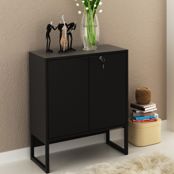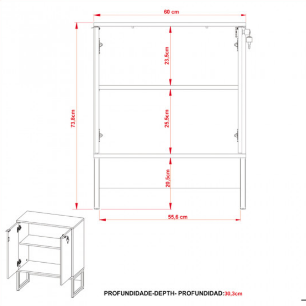 Armario 2 Puertas – 4154 2 puertas con cerradura Estante interno Confeccionado en placa de MDP 15 mm Terminación símil melaminica BP Base en hierro Medidas: Alto 74 cm Ancho 60 cm Prof. 30 cm