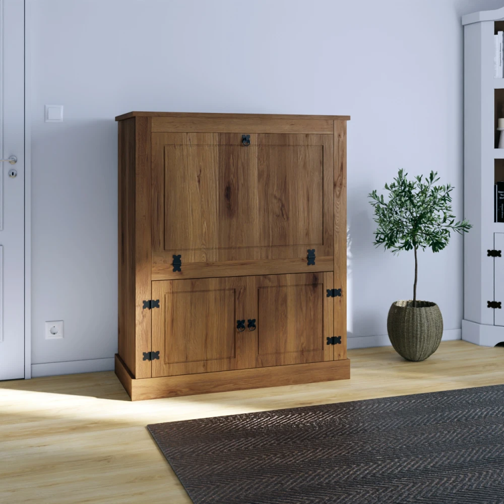 Bar Botellero – Linea Mexicana – Nogal Codigo: MEX058NO – Dimensiones totales – Altura: 120 cm Ancho: 97 cm Profundidad: 45 cm – Materiales – Madera Maciza