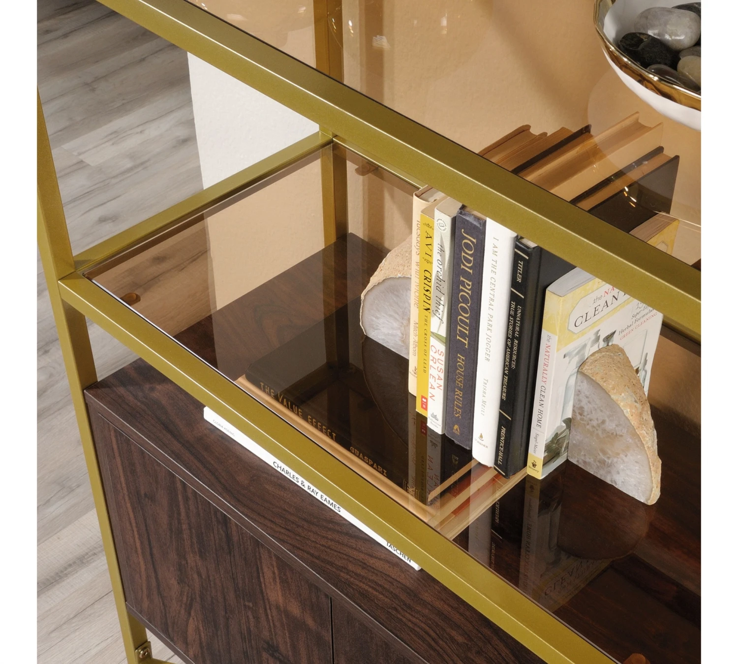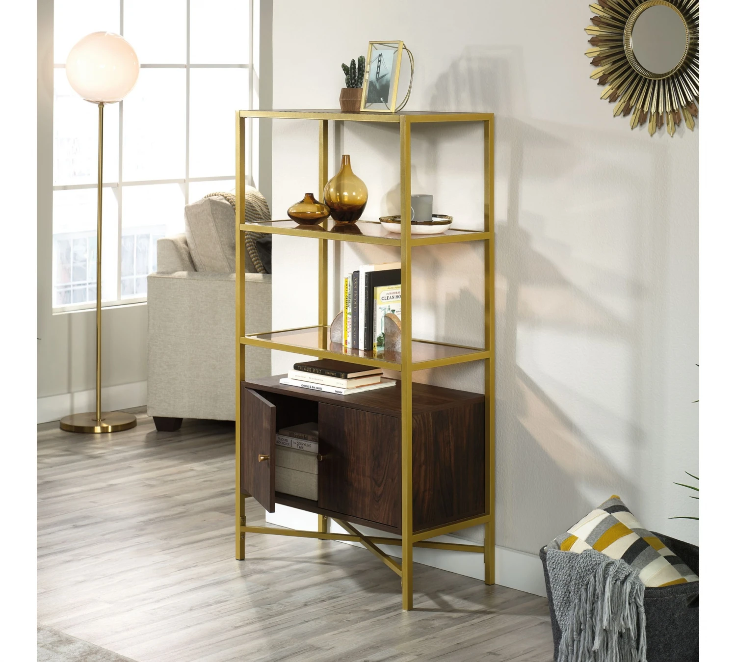 Biblioteca Estructura Metálica Sauder Código: 426451 Dimensiones totales – Altura: 131 cm Ancho: 70 cm Profundidad: 35 cm – Composición material – Madera de Ingeniería Metal Vidrio
