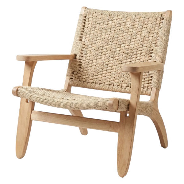 Butaca Hanoi Madera Natural Beige Código: 5533 Materialidad: – Madera de Caucho: madera dura, clara y sostenible – Cordón de fibra natural Medidas: Alto: 78cm Largo: 65cm Prof.: 57cm