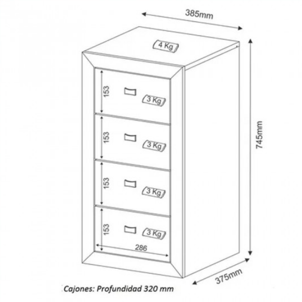 Cajonera Auxiliar 4 Cajones – 4133 4 cajones con rieles metálicos 4 ruedas de apoyo Confeccionado en placa de MDP laminado símil imitación madera Ideal para espacios reducidos Medidas: Alto 74 cm Ancho 38 cm Prof. 37 cm