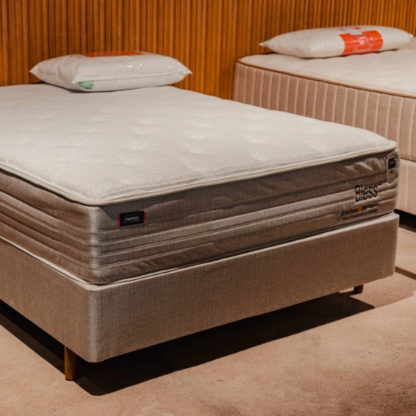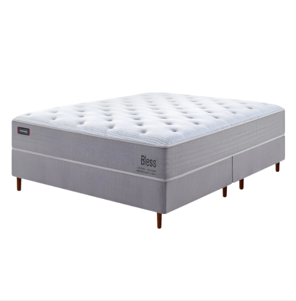 Conjunto Sommier Queen Bless Código: 2439 2451 – Dimensiones totales – Altura: 30 cm Ancho: 158 cm Profundidad: 198 cm Soporta: 150 kg Bases: 079x198x25 Material: Resortes Pocket y espumas