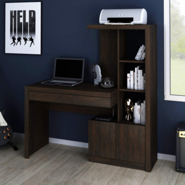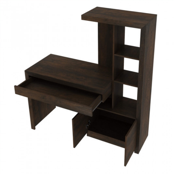 Escritorio con Biblioteca – 4143 – Rustico Ideal para hogar, muy funcional para espacios reducidos Cajón largo con mucha capacidad con rieles metálicos Repisa lateral con 2 estantes 2 puertas con espacio de guardado Confeccionado en placa de MDP de 15 mm Terminación estructura moldurada Medidas: Alto 138 cm Largo 123 cm Prof. 47 cm