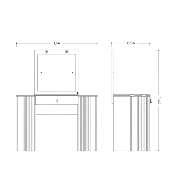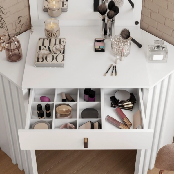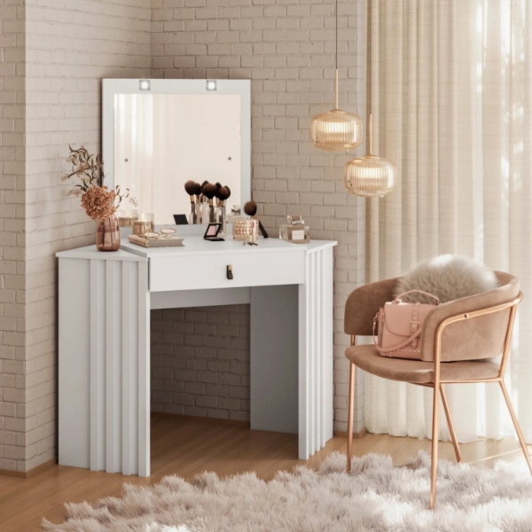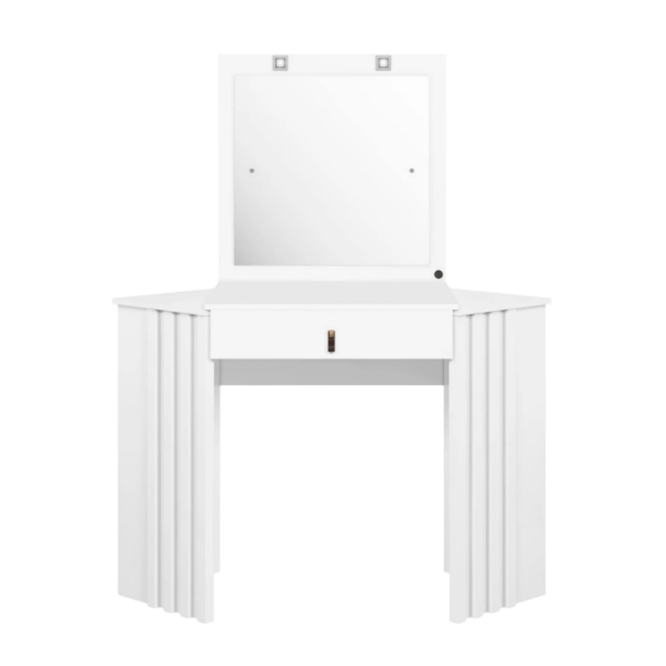 Escritorio Tocador Esquinero Glitter Código: 0000342-4505 Color: Blanco – Medidas: Altura: 140 cm Largo: 114 cm Profundidad: 54 cm Composición: MDP Tipo de correderas: Telescópicas Terminación: Pintura UV