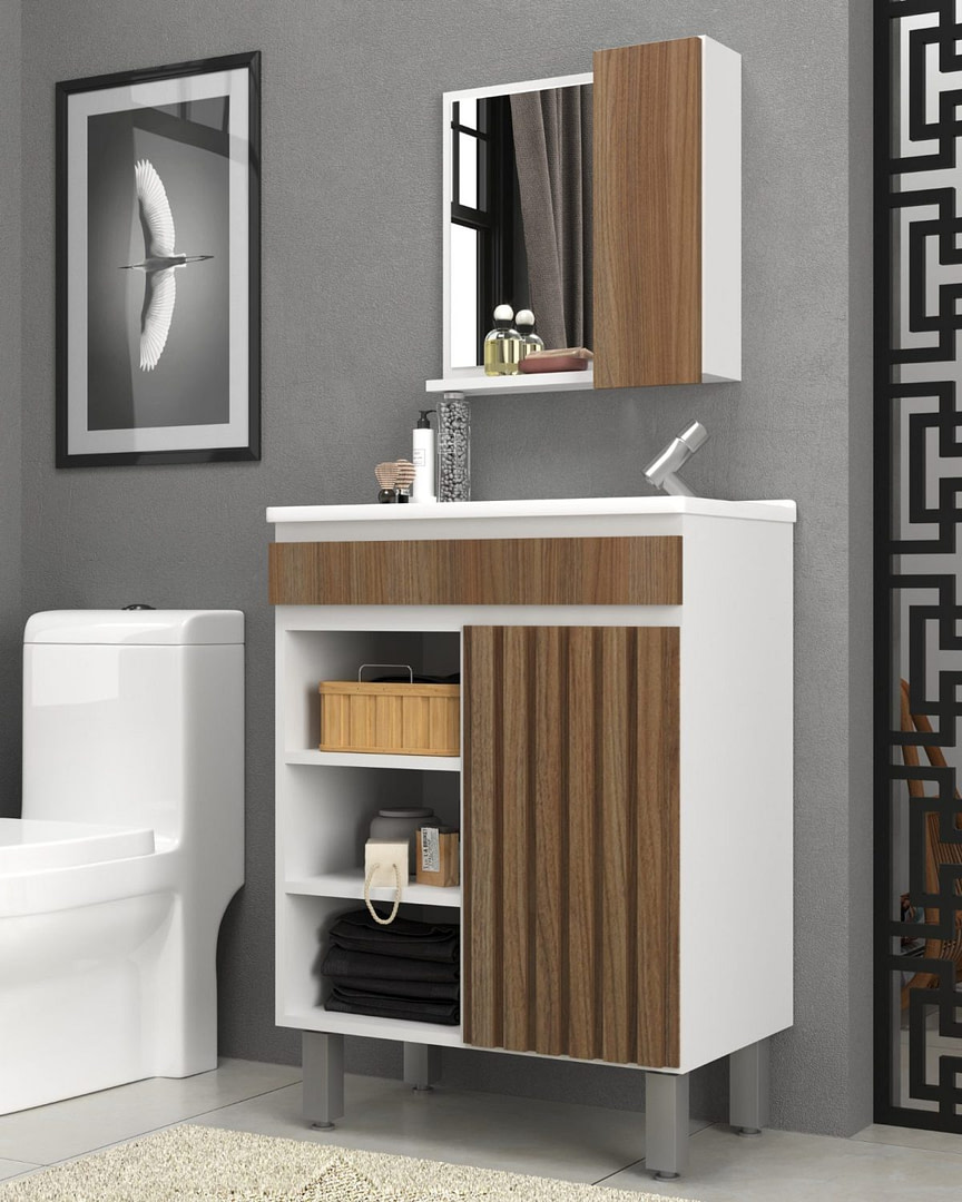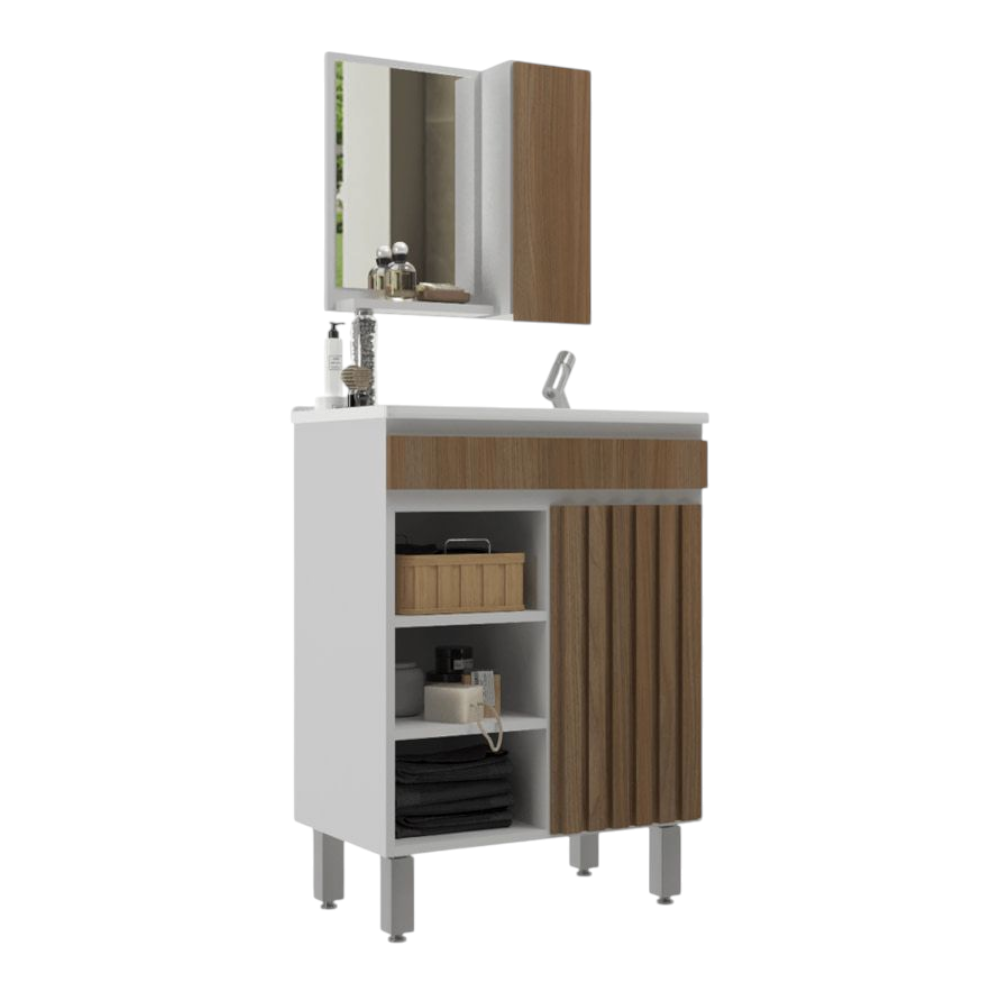Kit De Baño – Bello No incluya grifería. Material MDP. 3 estantes. 2 puertas. Medidas del mueble: Alto: 83 cm. Ancho: 55 cm Profundidad: 34 cm. Medidas del espejo: Largo: 45 cm. Ancho: 43 cm.