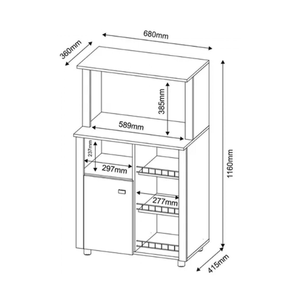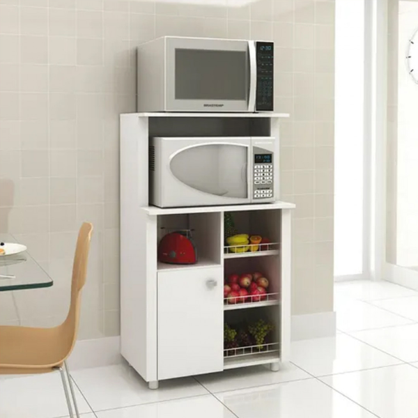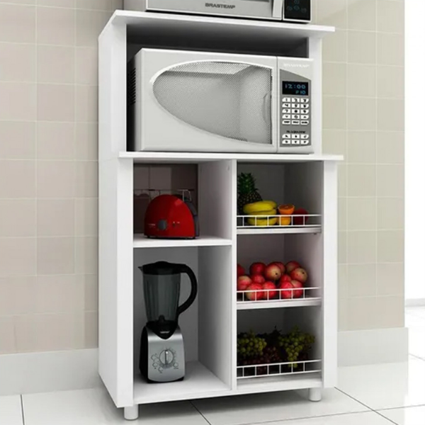 Multiuso Con Frutero – 3204 Espacio para microondas y para horno 3 canastos fruteros 1 puerta + estante arriba 4 patas en PVC fijas Confeccionado en placa de MDP de 15 mm Medidas: Alto 116 cm Ancho 68 cm Prof. 42 cm