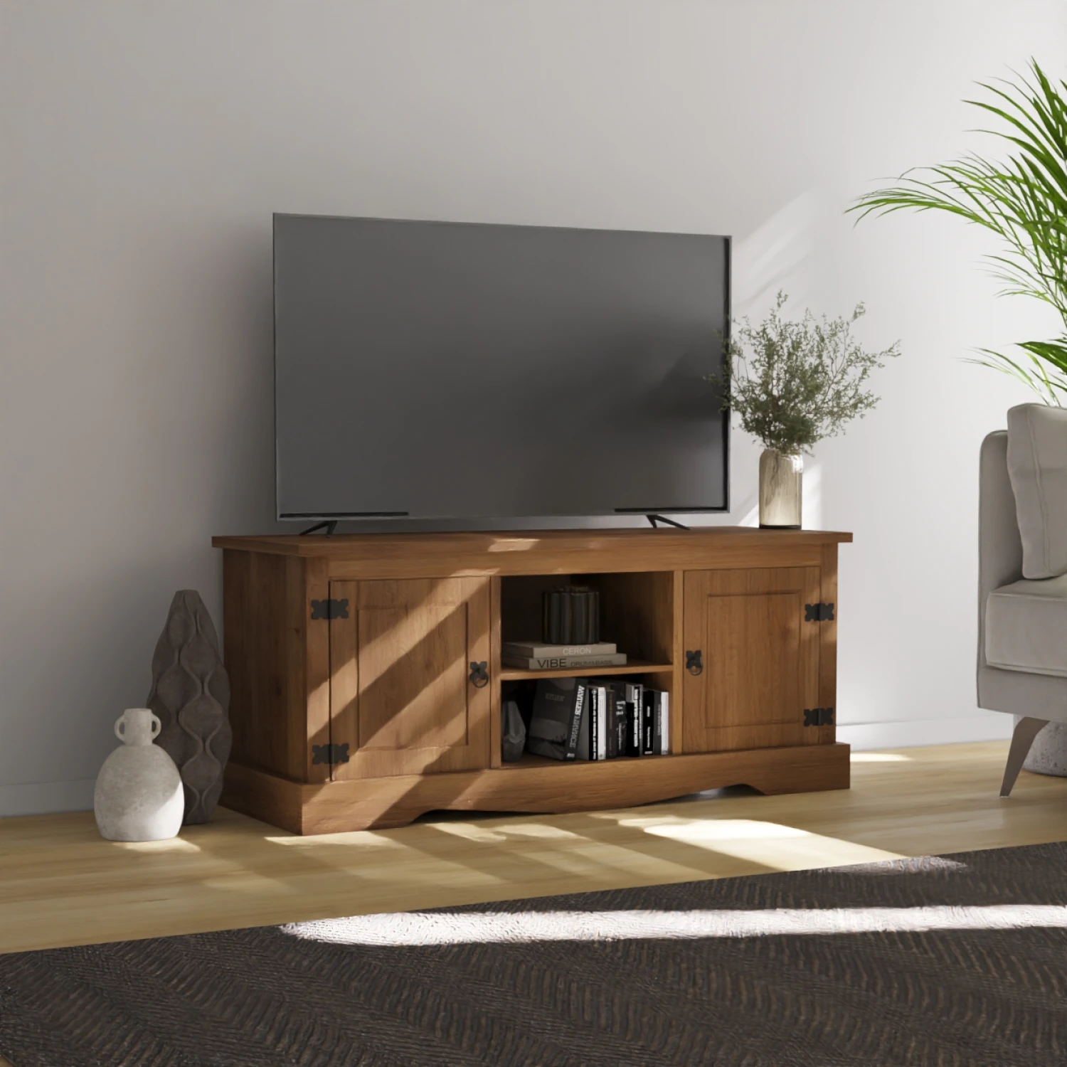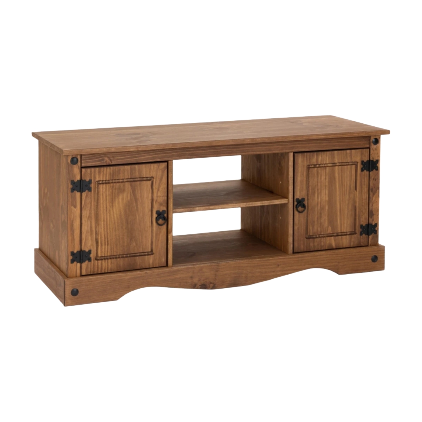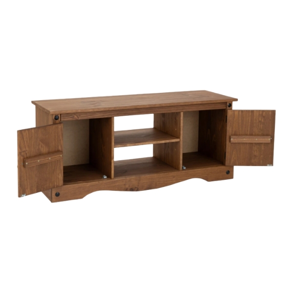 Rack 2 Puertas Línea Mexicana Código: MEX004 Material: madera maciza de pino – Color: Nogal – Cantidad de puertas: 2 – Cantidad de estantes: 1 – Medidas: Altura 52 cm Profundidad 41 cm Largo 120 cñm – Peso: 19 Kg.