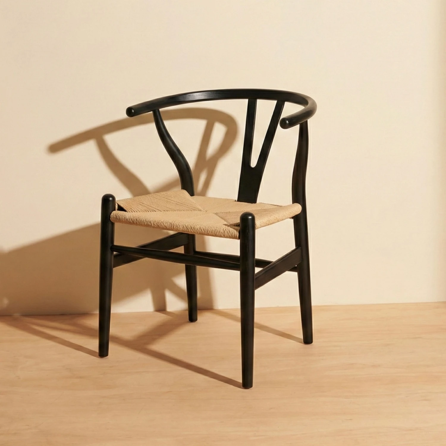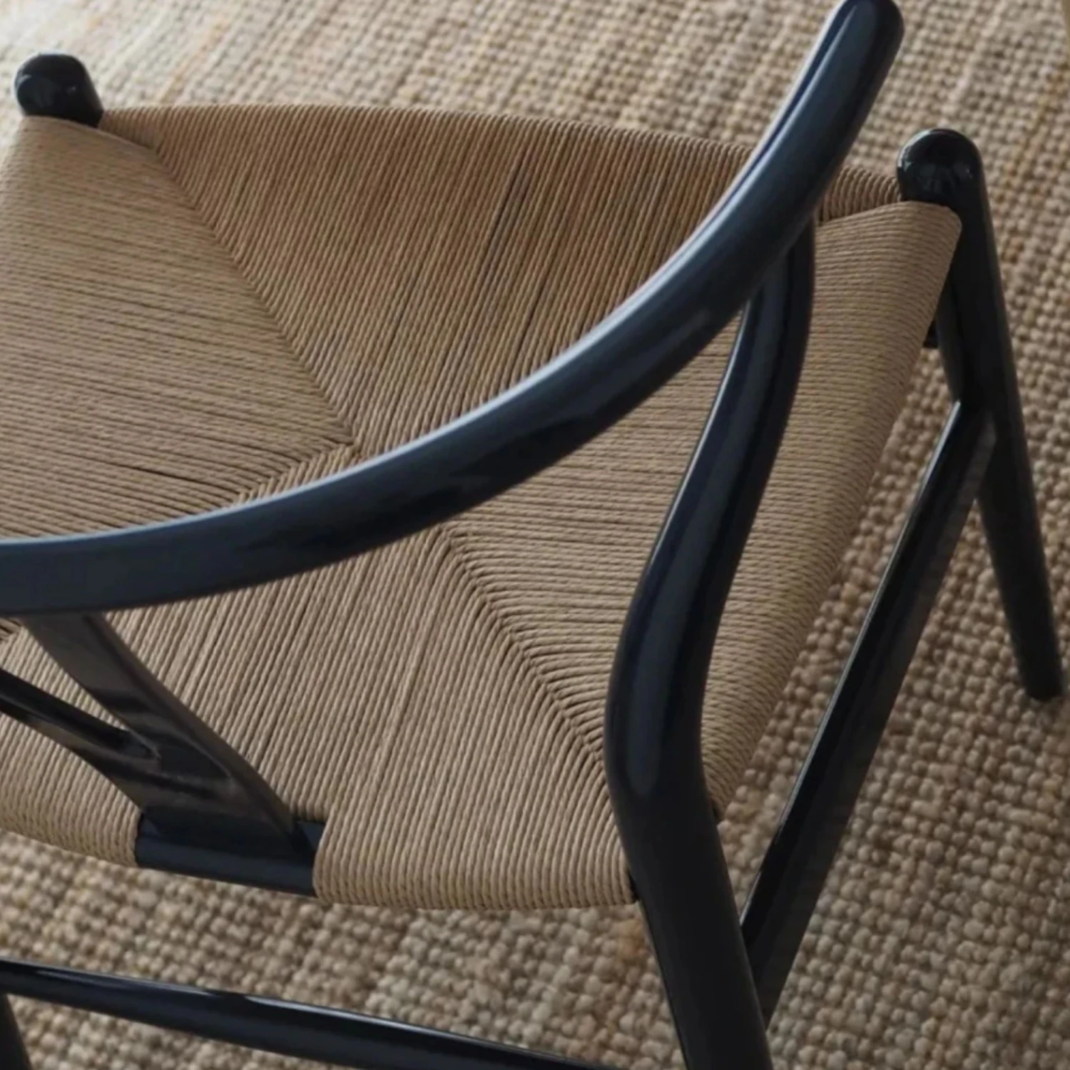 Silla Wishbone Negro Código: 0000544-5532 Materialidad: – Madera de Caucho: madera dura, clara y sostenible – Cordón de fibra natural Medidas: Alto: 87cm Largo: 62cm Prof.: 59cm