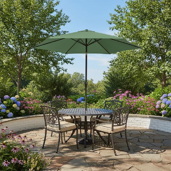 Sombrilla De Jardin 3.0m Código: 0000444 – 4919 Color: Verde Dimensiones totales – Altura: 247 Cm Ancho: 300 Cm Profundidad: 300 Cm Materiales – Acero + Poliester Peso: 5,8kg
