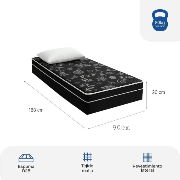 Sommier Guaruja 1 Plaza Medidas Colchon: Alto 20cm / Largo 188cm / Ancho 90cm Alto Base: 34cm Soporta hasta 80kg Material: Espuma