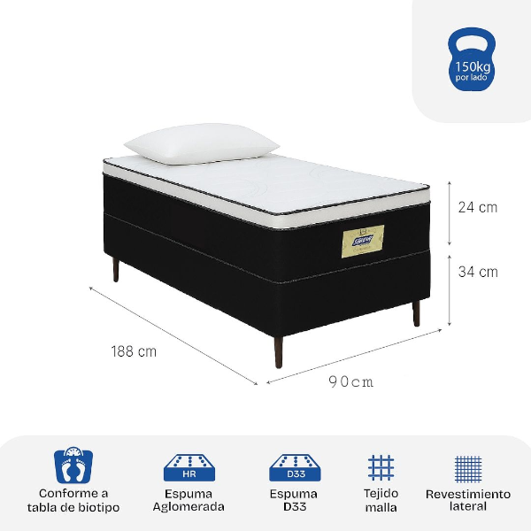 Sommier Summer 1 Plaza Medidas Colchon: Alto 24cm / Largo 188cm / Ancho 90cm Alto Base: 34cm Soporta hasta 150kg Material: Espuma
