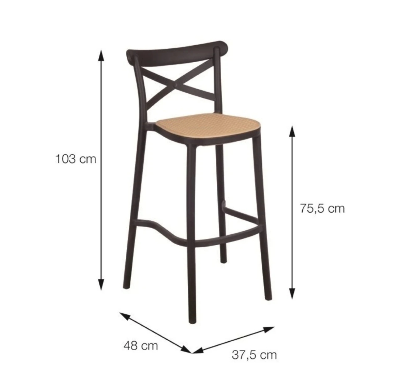 Taburete Plats Simil Rattan Negro Código: 0000095-3570 Color Negro – Materiales Alto: 1,03 m Largo: 0,38 m Ancho: 0,48 m Ideal para uso: Exterior Peso soportado: 120kg