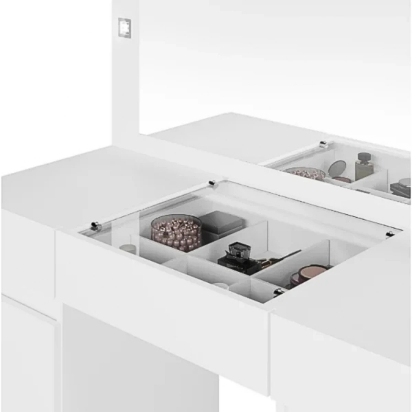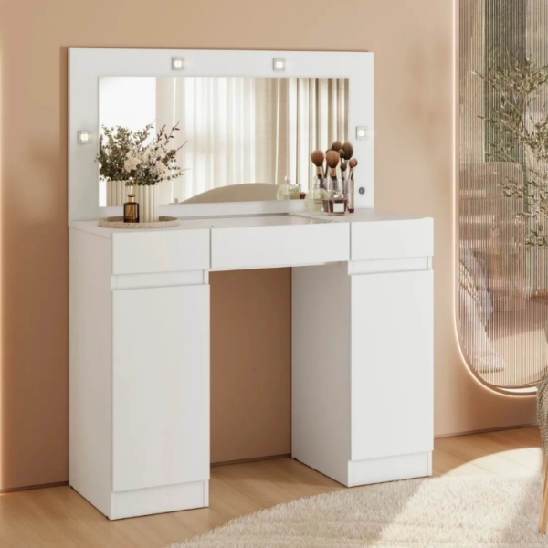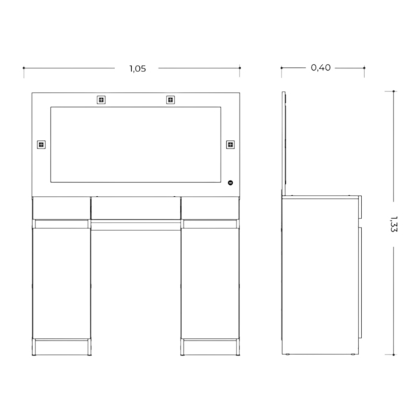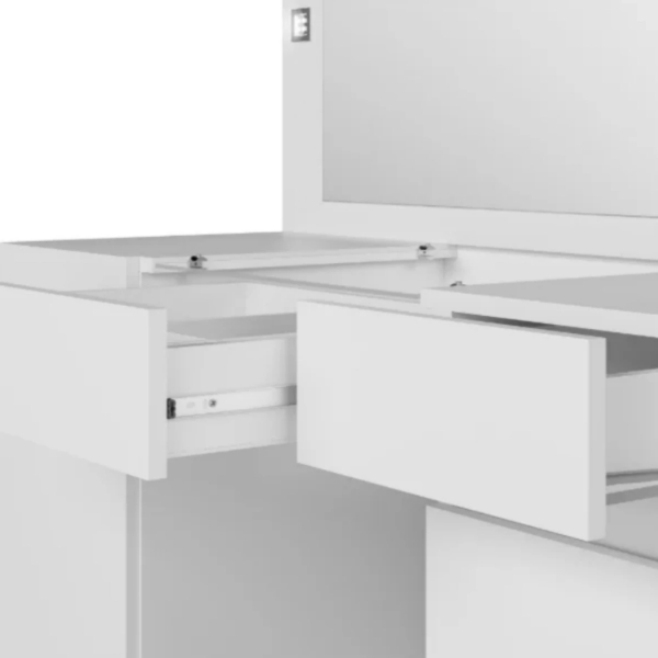 Tocador Espejo Grande Led Studio Código: 0000344-21501135 Color: Blanco – Medidas: Altura: 133 cm Largo: 105 cm Profundidad: 40 cm Composición: MDP Tipo de correderas: Metálicas Terminación: Pintura UV Espejo Led